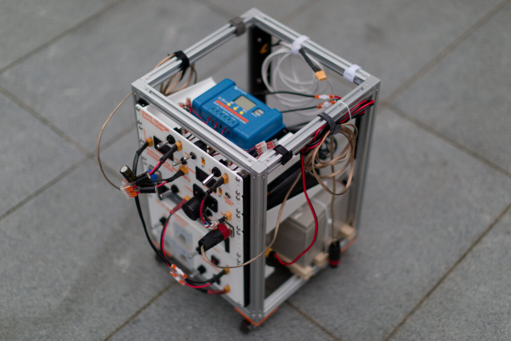 I bought some pre-cut 2020 aluminium extrusions from RM Components (Melbourne) and some metal corner joints. Some lockable miniature caster wheels make it easy to transport – the two SLA batteries aren’t light.