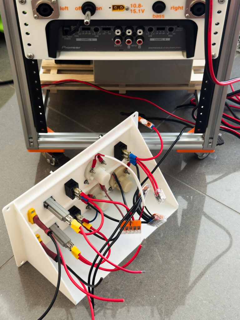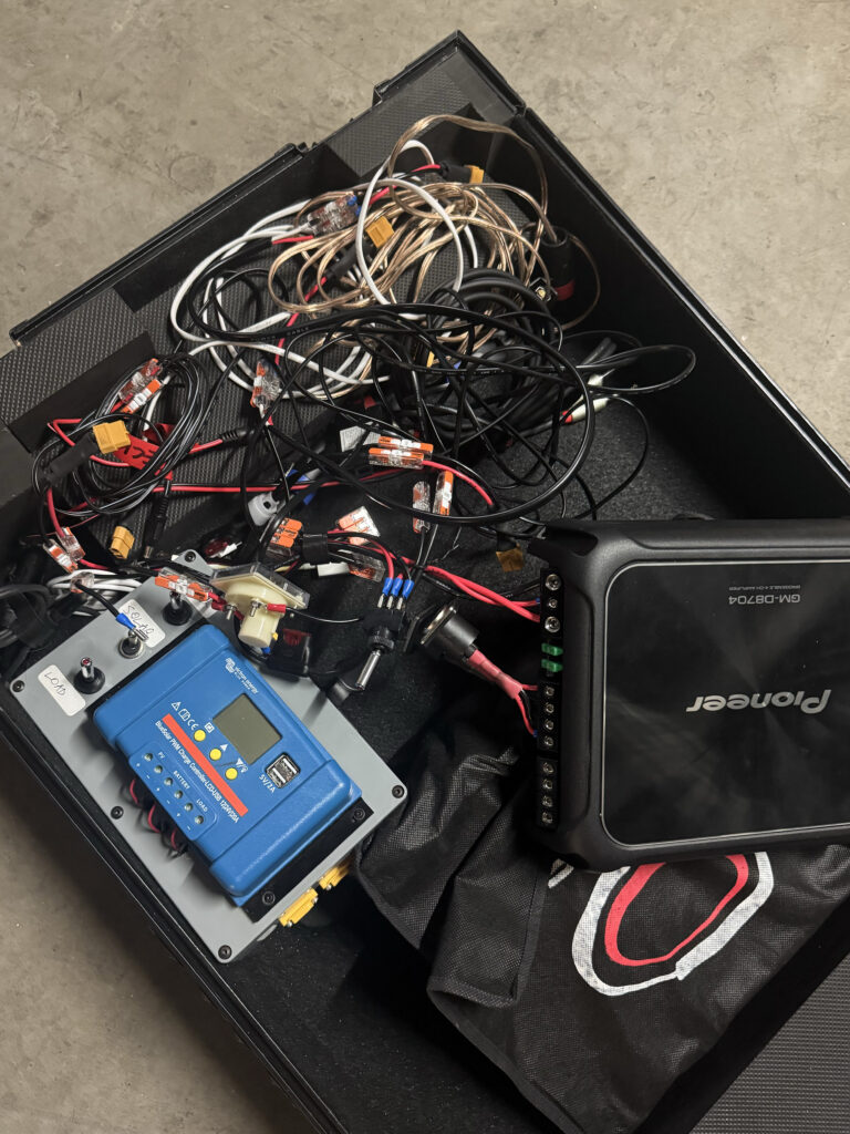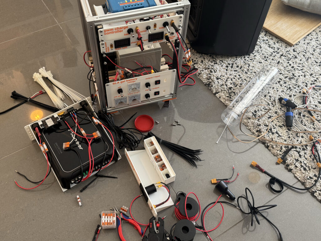 - Half way through the first party after completing the initial rack build I found the Victron PWM solar charging caused buzzing in the speakers, I assume because of the PWM frequency operating in the audible range. A couple of big electrolytic capacitors into some 5-way WAGOs on the input/output seemed to solve this!