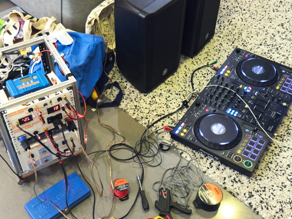 The obvious answer would be Bluetti / Ecoflow / Anker style portable power station to plug in the DJ decks and an efficient music amplifier for PA speakers – but these power stations aren’t cheap.