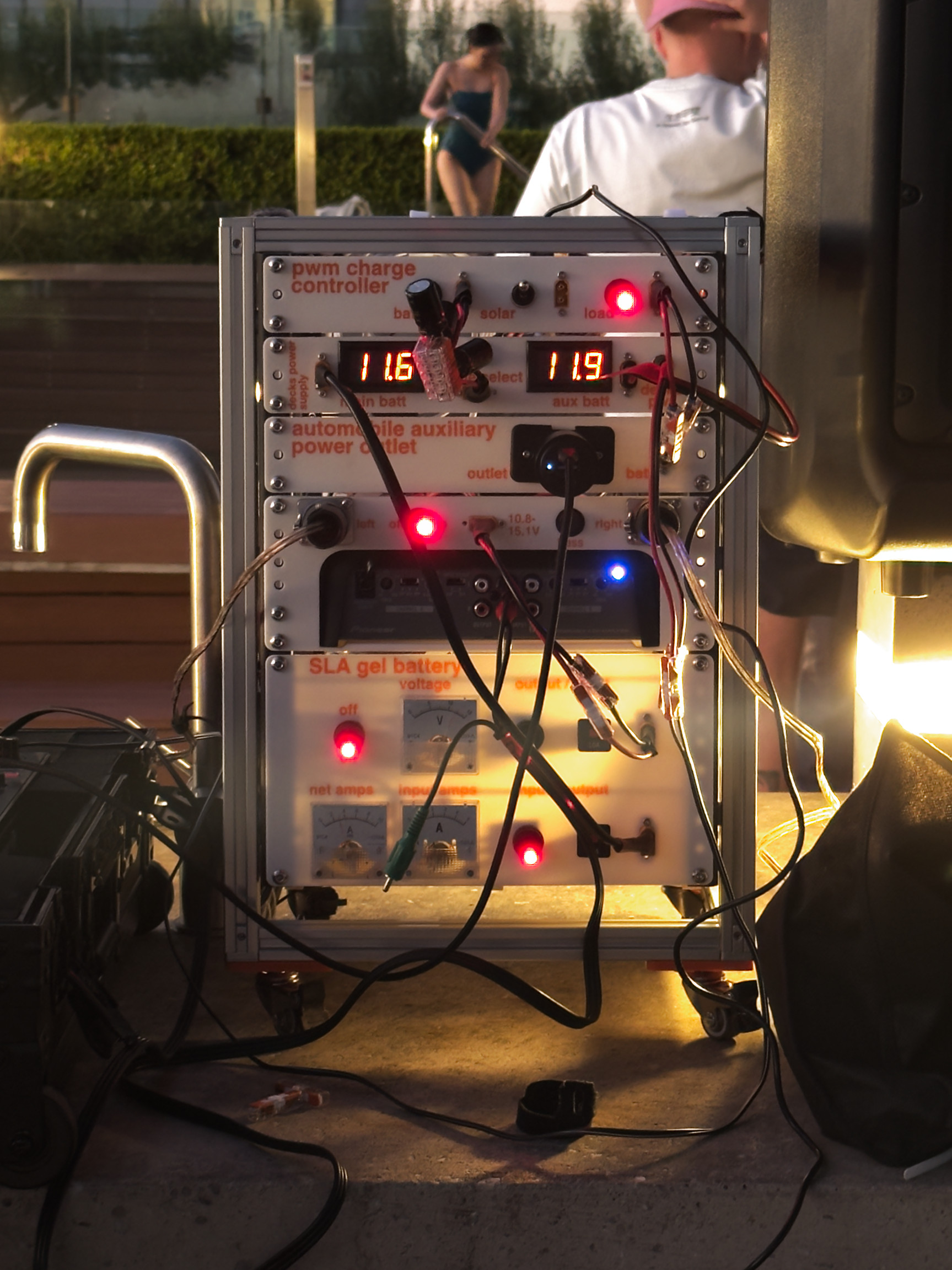 What’s one to do when you want to play a DJ set but you don’t have a power point? Here’s some photos of a initial build of a solar powered speaker amplifier and Pioneer FLX-10 power supply 8U mini rack!