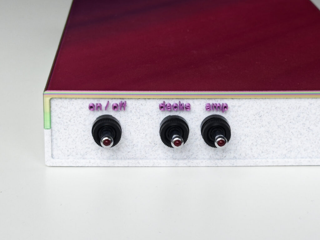 The Leipai is only a 20W per-channel amp powering low-efficiency speakers – so I bought a more powerful Fosi amp (which also served home listening). These amps need a higher DC voltage to work well, so I tried out a bare PCB DC-DC boost converter (pictured above). This struggled to keep a steady voltage during bass-heavy beats, so I got a beefier potted DC-DC buck/boost converter. I 3d printed a nice case with ventilation which fit in the 19″ 1U rack slot in the road case for the decks.