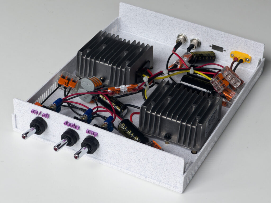 You may recognise this case as being generated by the Ultimate Box Maker parametric OpenSCAD design. I wrote some OpenSCAD code for the XT60 and switch ports, along with mounting points for the DC converters.