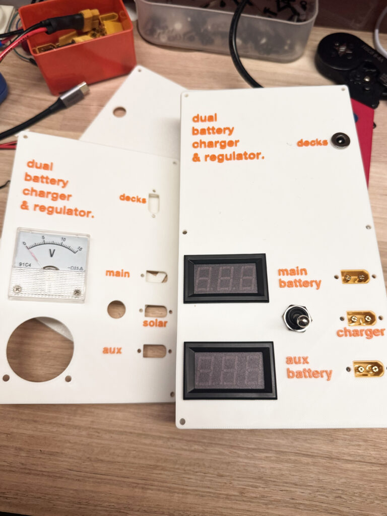 - analog panel meters for voltage (good to spot ripple) net power consumption and charging current