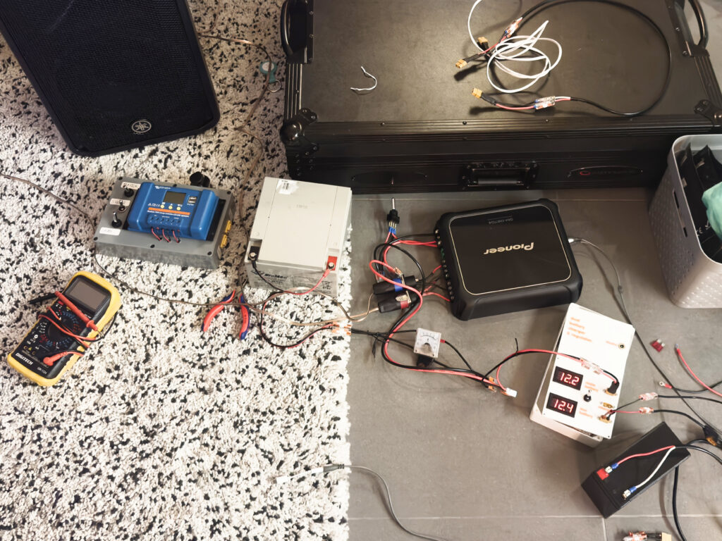 The very first iteration was essentially a Lepai LP-2020A+ connected to a car battery to power some wooden bookshelf speakers, and a DC-DC converter to output a perfectly steady 12 volts for the decks. Adding a basic PWM solar charger and a portable solar panel extends the run time, sometimes indefinitely!